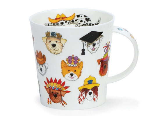 • A white fine-bone china mug featuring an assortment of illustrated dog heads of varying breeds, wearing hats in a comical fashion. It shows Terriers with a tam o' shanter bonnet, a Corgi with a crown & a Dalmatian with a graduation cap, just to name a few. The inner rim features a black and white Dalmatian with a Western hat and an orange dog with a sombrero.