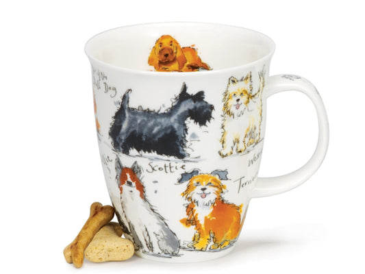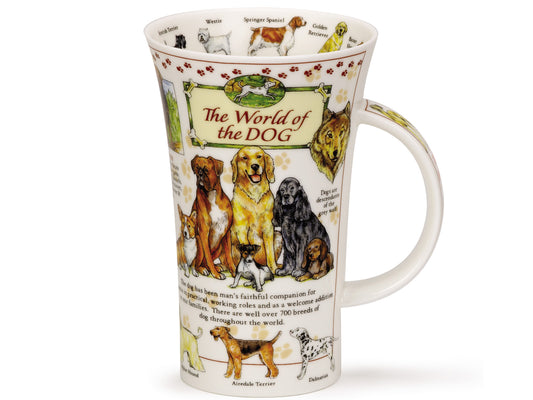 • Dunoon Glencoe World of the Dog Mug is a large fine bone china mug with various breeds of dog printed all around its exterior, accompanied by the different groups of dogs and a small piece of information about each. There are small pictures of different breeds of dogs printed around the inner rim of the mug, and the base colour of the mug is white.