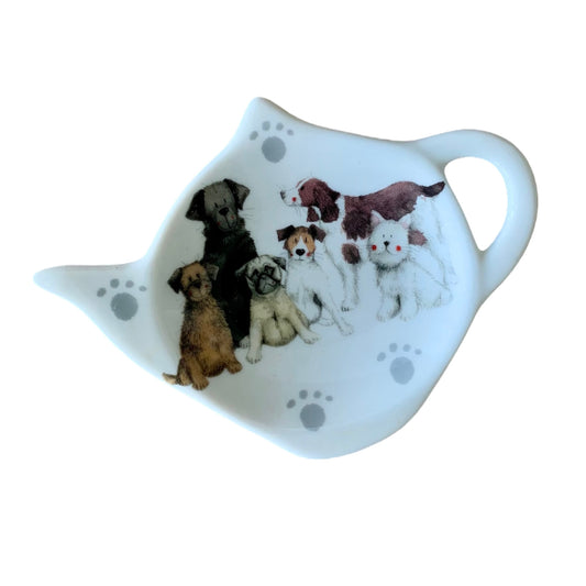 • This Alex Clark teabag tidy is illustrated with a group of assorted breed of dogs. There is also a matching teapot & mugs in the same illustration.