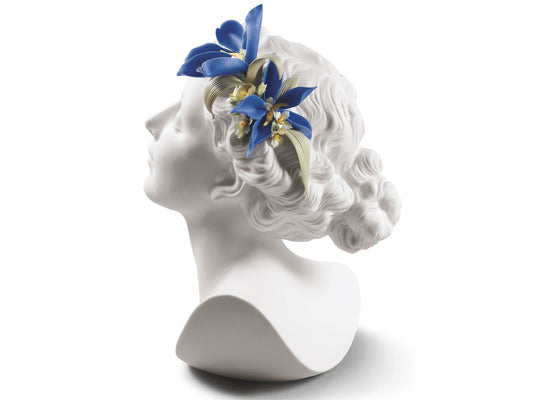 • A bust of a woman on a cylinder who is leaning on her elbow. The piece is made of dark grey porcelain with matte and metallic finishes with leaves painted across her face and one arm