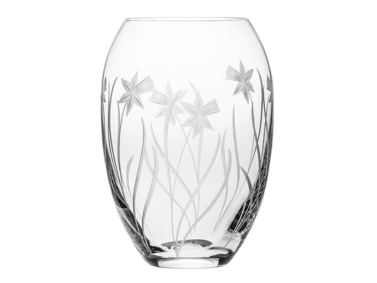 • A crystal barrel vase with delicate daffodils engraved on the outside