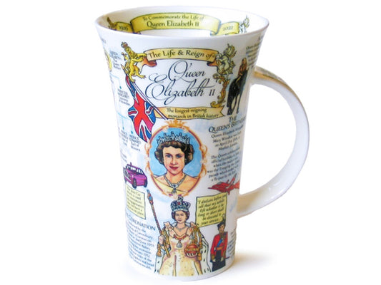 • Commemorating the life and reign of Queen Elizabeth II, this large fine bone china mug showcases significant events and memories.