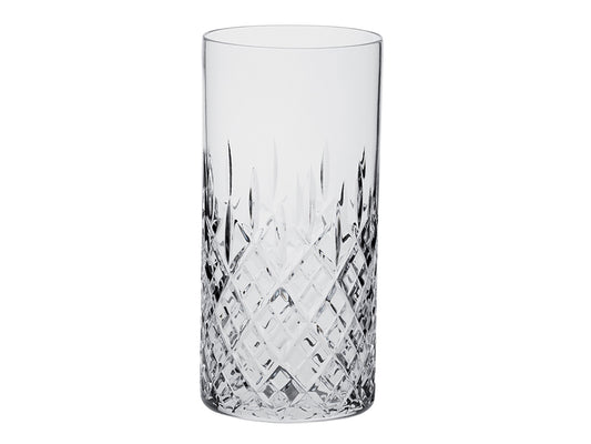 • A single crystal highball tumbler with straight edges, featuring a cut design with a bed of diamonds at the base and single darts reaching up towards the clear rim