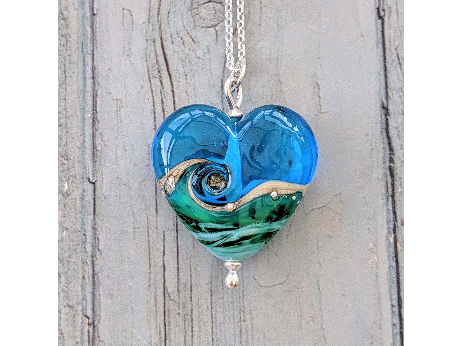This hand-made Beach Art Murano Glass Deep Blue Sea Heart Pendant forms a stunning depiction of the sea, with a vibrant deep blue and transparent glass decorated with fine silver and a stunning sandy swirl. The silver detailing is made from 99% pure fine silver which has been melted onto the surface of the glass.