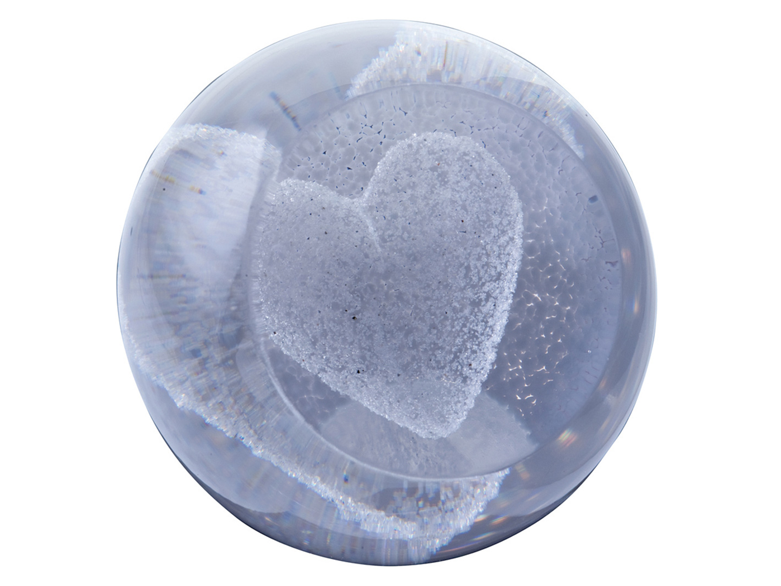 Caithness Special Moments - Silver Hearts Here is a beautiful silver heart paperweight. The heart is created using a metal crimp in the shape of a heart, sand is melted onto the end of the glass and pushed onto the crimp, grey, silver coloured glass chips are then melted onto the back and the glass is shaped with a small wooden block before being put into the kiln to cool.