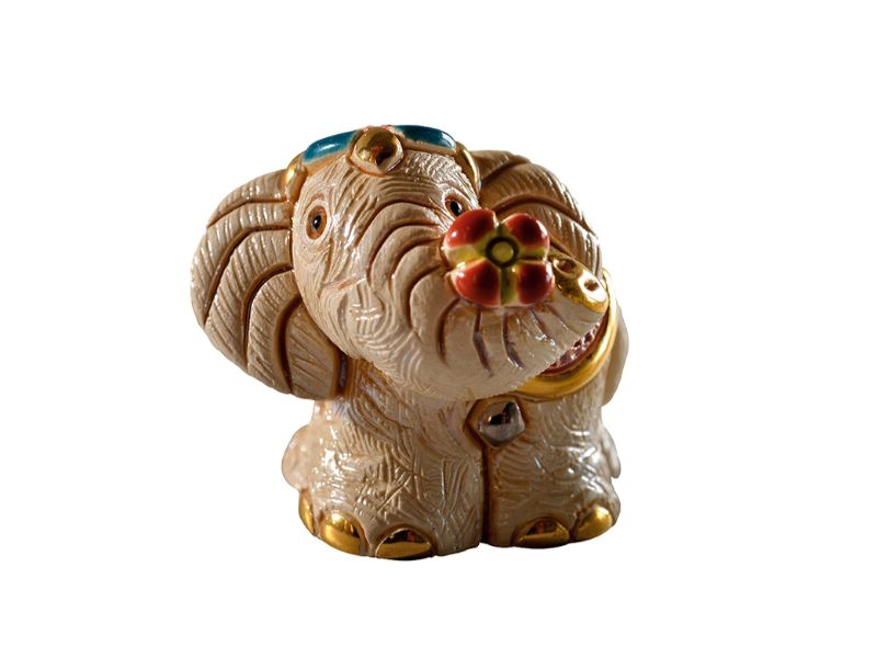 Each De Rosa product is a statement of skill and precision; all handmade and decorated to the highest of standards and ensuring no two products are ever carved exactly the same, creating a one of a kind ceramic figurine. A beautiful De Rosa Mini Elephant I holding a flower, finished with lovely gold embellishments and stunning detail.
