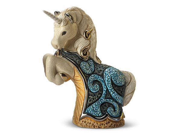 Elevate your home decor with the De Rosa Unicorn Blue. Exquisitely crafted from sturdy ceramic, this figurine depicts a majestic unicorn standing on its hindquarters, its orange underbelly & base complemented by a regal blue & grey cape. Long, luxurious tresses flow from its head, accented with hints of gold & platinum amidst the curls & tail.
