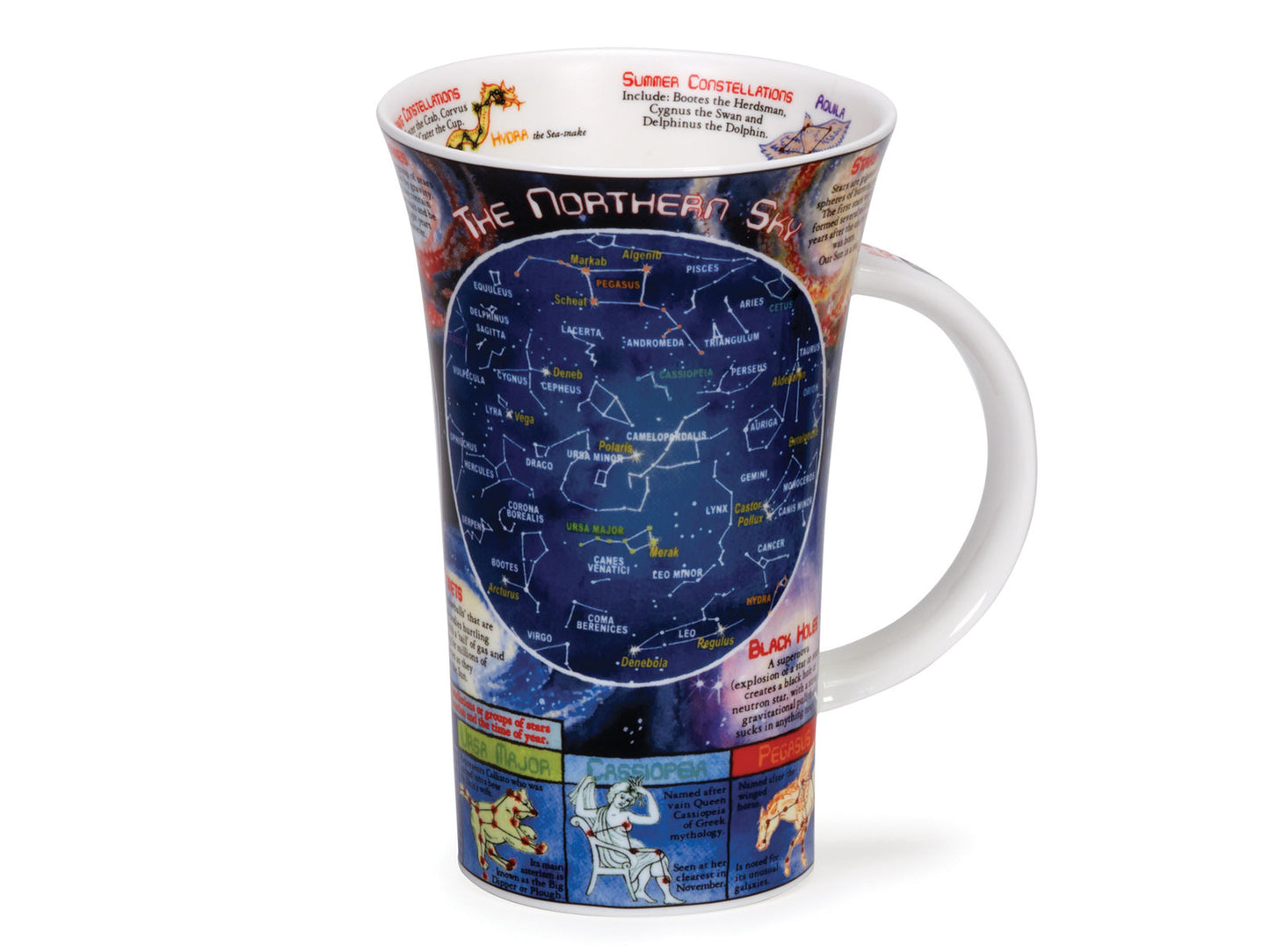 This intricately illustrated fine bone china mug celebrates the beauty of the night sky, perfect for any fan of stargazing. With maps of the northern and southern sky, as well as seasonal constellations and facts about the history of space exploration along the handle, this large Dunoon mug has plenty of space for your favourite beverage. It makes a wonderful birthday gift and is sure to be a treasured piece of homeware for years to come, even on cloudy nights!
