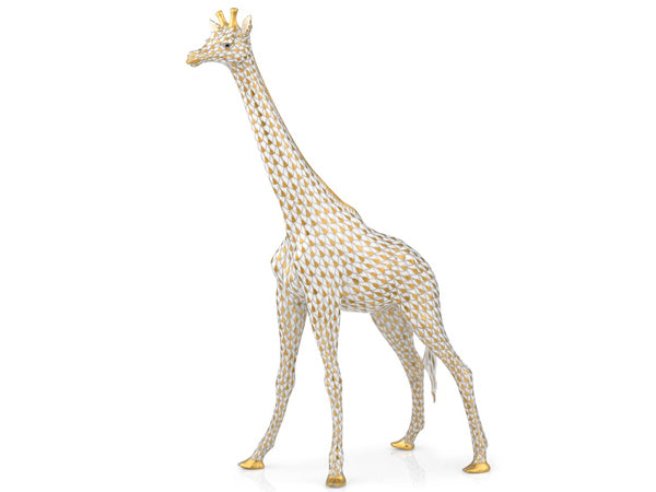 The majestic Big Giraffe showcases its splendour adorned in the Vieux Herend (VHOR) Gold Fish scale pattern. This distinctive fishnet or fish scale design is emblematic of Herend's craftsmanship. This breath taking glazed porcelain figurine of a giraffe who stands tall and proud would look stunning within your home. Gold lustres are also hand painted on the hooves and horns giving the piece a unique and individual look.
