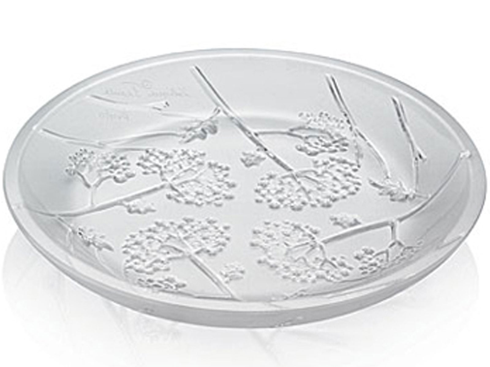 Delicately positioned on a flat bowl, flowers are suspended in glistening crystal. This gorgeous design features the Umbel of a flower, or the Umbrella like stems that sprout from the flower, in a delightfully attractive, but subtle pattern on a flat bowl.