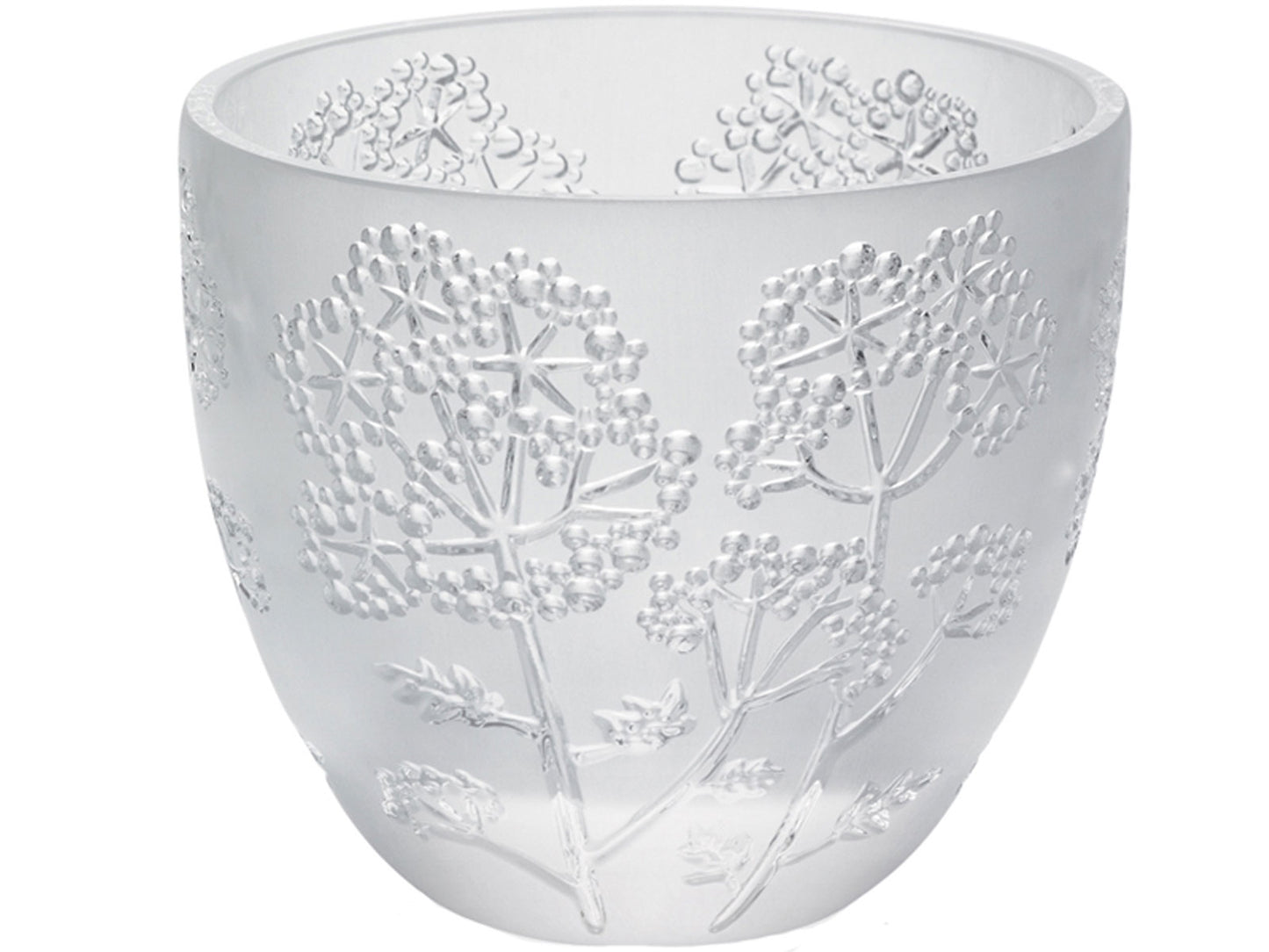 Delicately positioned on the crystal votive, waves of flowers are suspended in glistening crystal. This gorgeous design features the Umbel of a flower, or the Umbrella like stems that sprout from the flower, in a delightfully attractive, but subtle, pattern on a small candle votive.