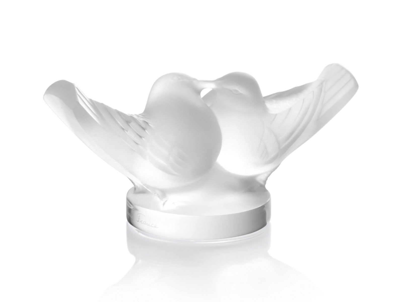 This delightful pair of Lalique Crystal Lovebirds are interlocked in an intimate embrace, they would make a lovely gift for a wedding, engagement or anniversary. Based on an original 1931 René Lalique design. A new large version, in Large Clear crystal, was released by Lalique in 2011, alongside a Gold and Blue Luster version in 2014. This Small original Clear version was introduced by René Lalique in 1931 and the design is still as beautiful today.
