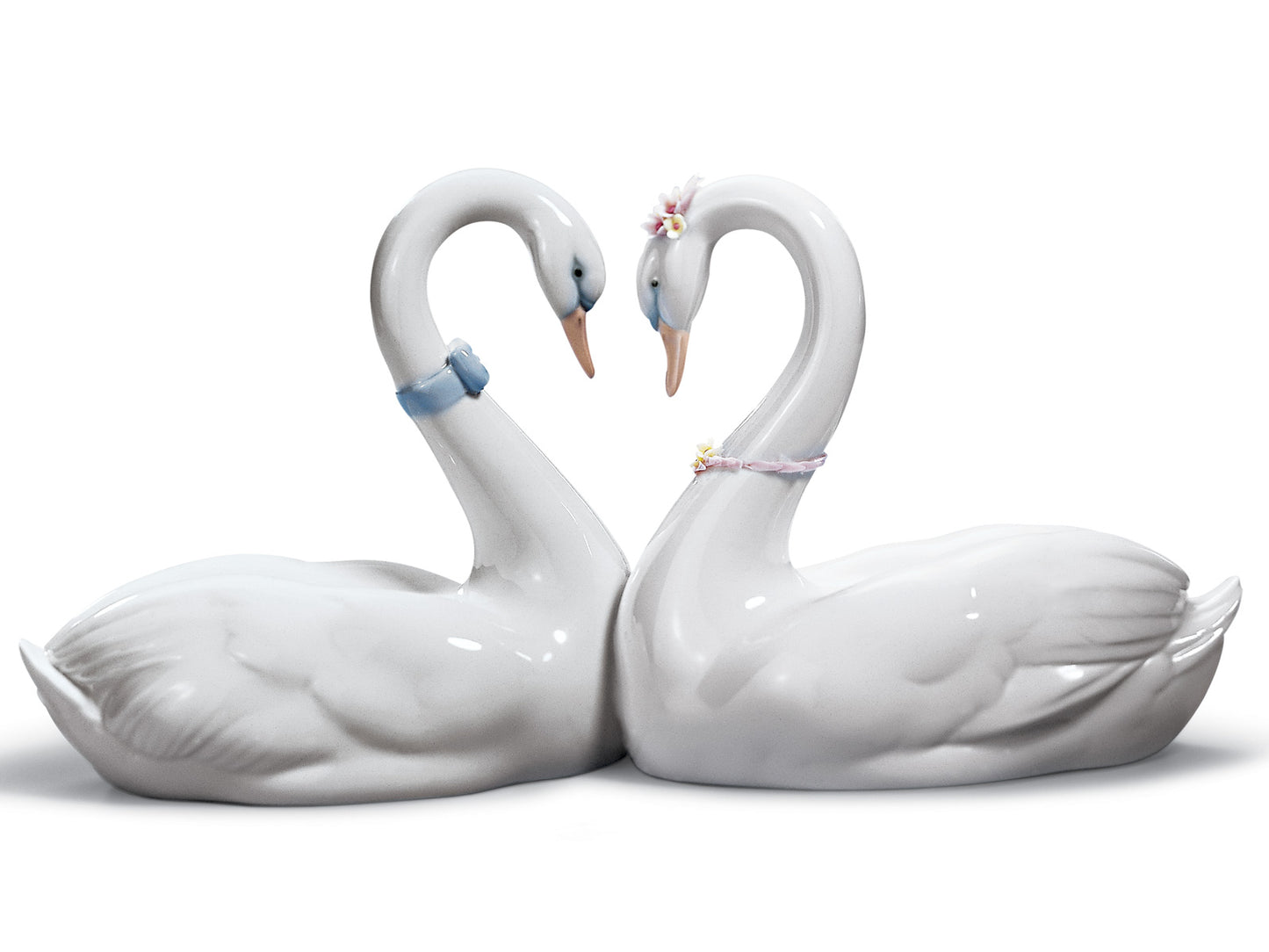 This Lladro piece is a porcelain figurine depicting an pair of elegant swans as they swims along, arching their necks in an intimate pose to form a loving heart shape. Epitomising a tender loving relationship, the white colour connotes purity and peace, and the pastel hues of the blue bow and pink hand-made flowers add a charming splash of colour to the piece. The stunning level of detail in this piece gives it a lifelike quality, completing this wonderful and classic piece from Lladro. Have a browse through the whole Bridal & Romance catalogue to find that perfect gift for your perfect someone.
