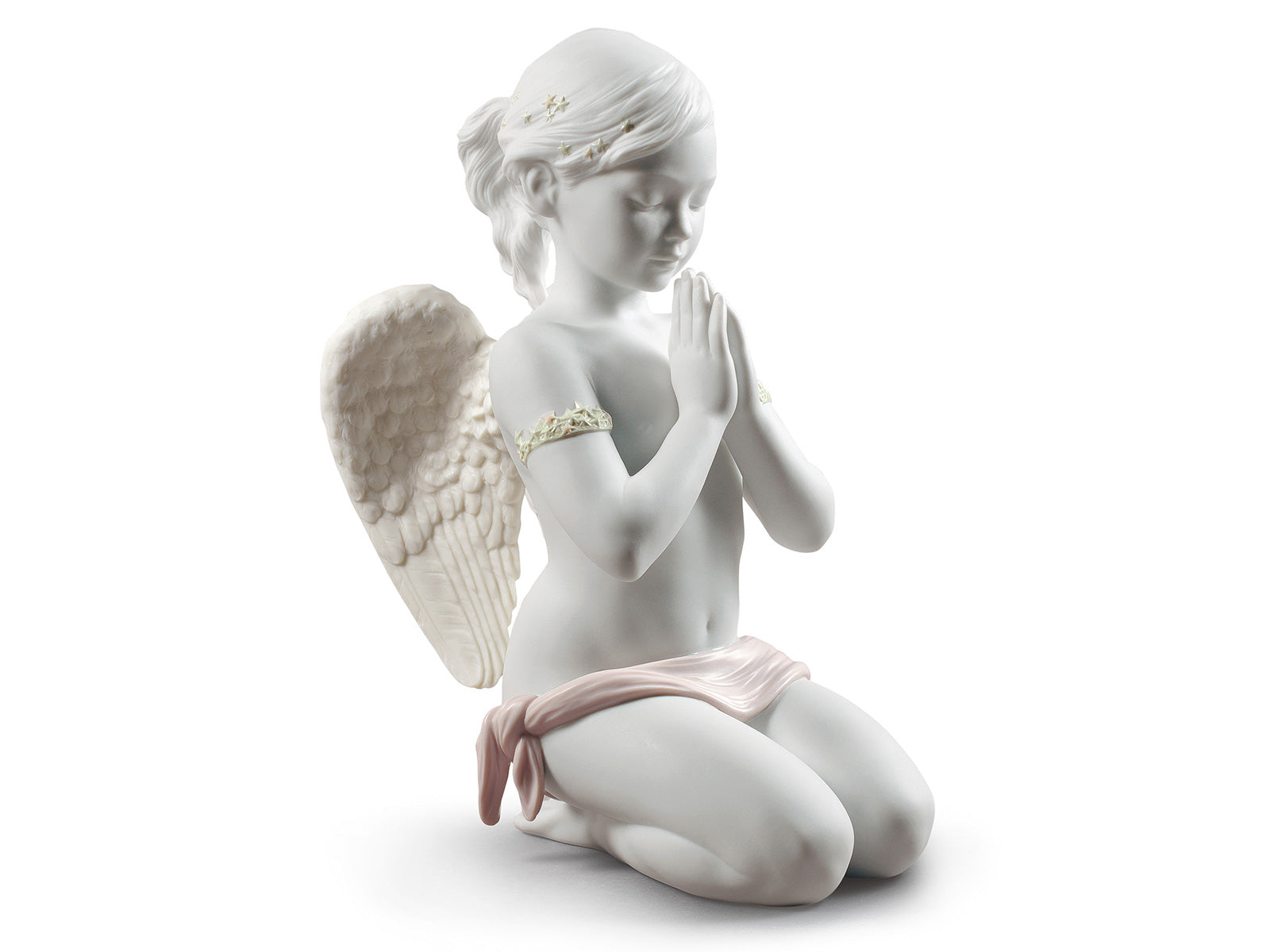 Lladro's Heavenly Prayer is a stunning piece, capturing a porcelain angel sat on her knees with her hands together in prayer. This piece is crafted from matte white and coloured porcelain. This would be a perfect gift for a very special person, who is kind caring & loving. Follow the link to view our full Lladro Angel Collection or Click here to browse through our stunning Lladro Children & Youth collection.