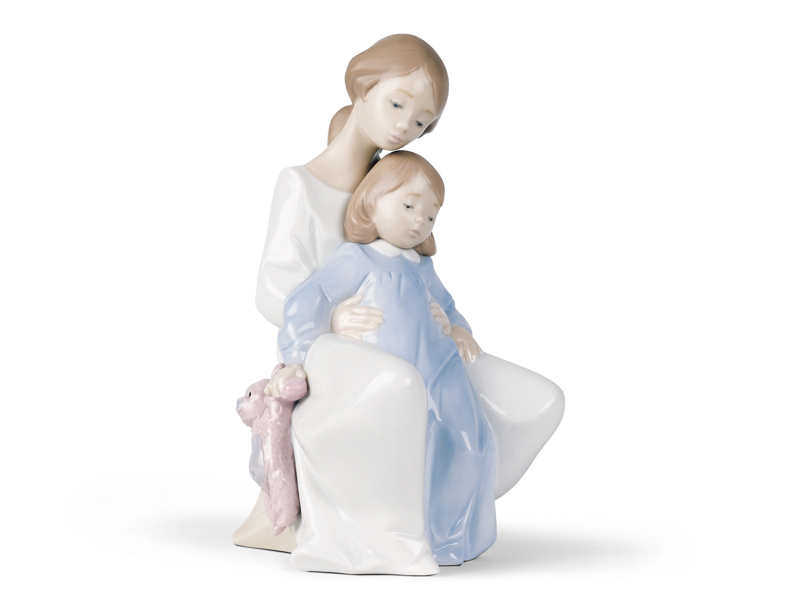 This beautiful Nao porcelain figure features a seated woman tenderly holding her young daughter. The mother is wearing a long, white dress and caringly looking at her daughter; the daughter is wearing a light blue nightgown as she leans into her mother and holds her favourite pink bear in her hand. The piece from Nao captures a wonderful moment between mother and daughter and would make a thoughtful Mother’s Day present. Sculptor: Juan Huerta Nao offer numerous charming figurines in their Family Porcelain, available at The Chinashop®. Or, if you’re shopping for Mother’s Day, we have an extensive selection of products in our Mother’s Day Gifts Selection.