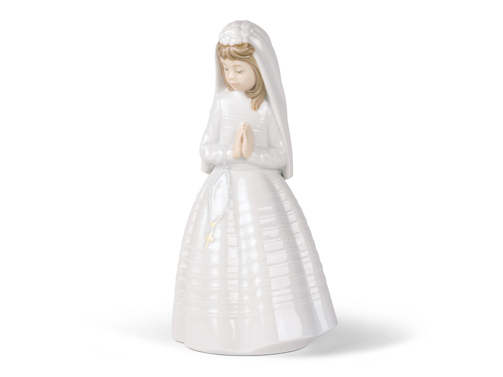 Here is a lovely porcelain figurine of a girl standing in a white dress and veil, with her hands together in prayer. The detail in the girl’s dress and hair makes this a perfect gift to congratulate someone special on their Holy Communion. Sculptor: José Roig See more Christian-inspired porcelain in Nao’s Religious, Communion & Christening Figurines, and more adorable children figures in their Children & Childhood Porcelain.