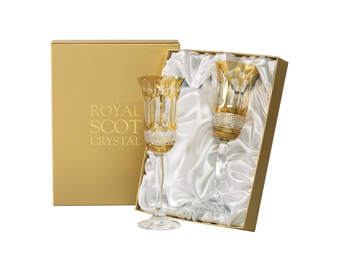 What better way to celebrate than with a bottle of champagne & these elegant gold crystal champagne flutes? They are all hand-cut with Royal Scot's opulent Belgravia design, which captures the glamour of the London district it takes its name from. This pair would be a wonderful wedding gift for the special couple in your life!