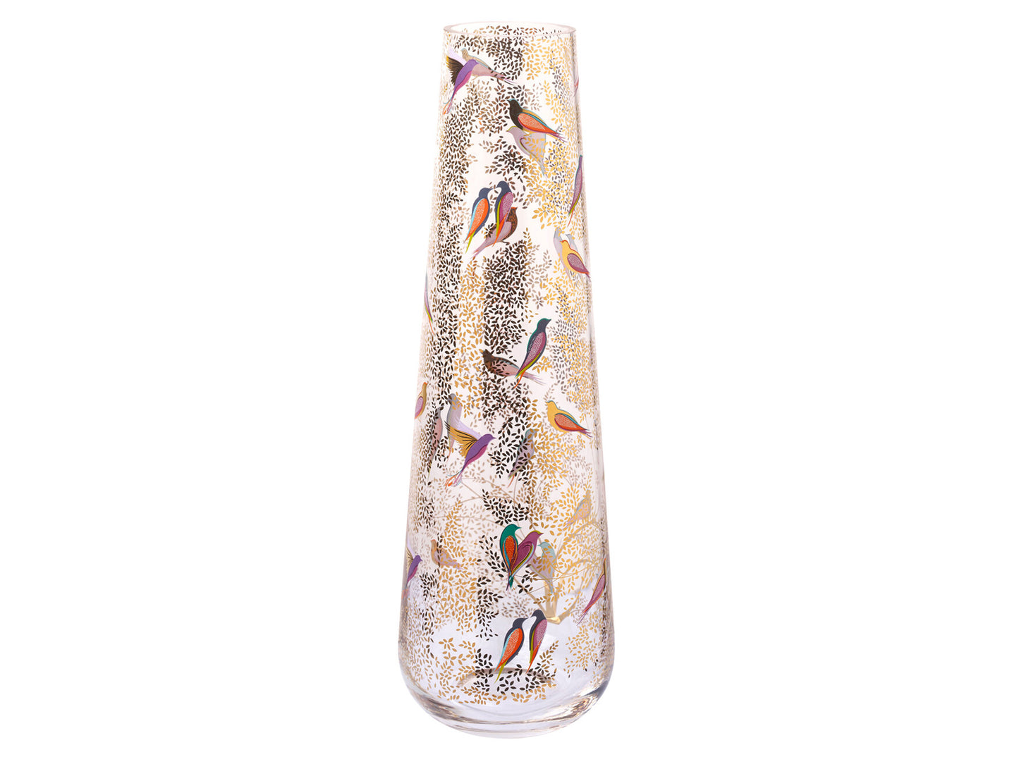 This elegant vase from the Sara Miller London Chelsea collection is perfect for holding lilies or long stemmed roses. The outside of the glass is embellished with intricate gold foliage and vibrant birds perching amongst the leaves. It would make a lovely gift for that special someone.